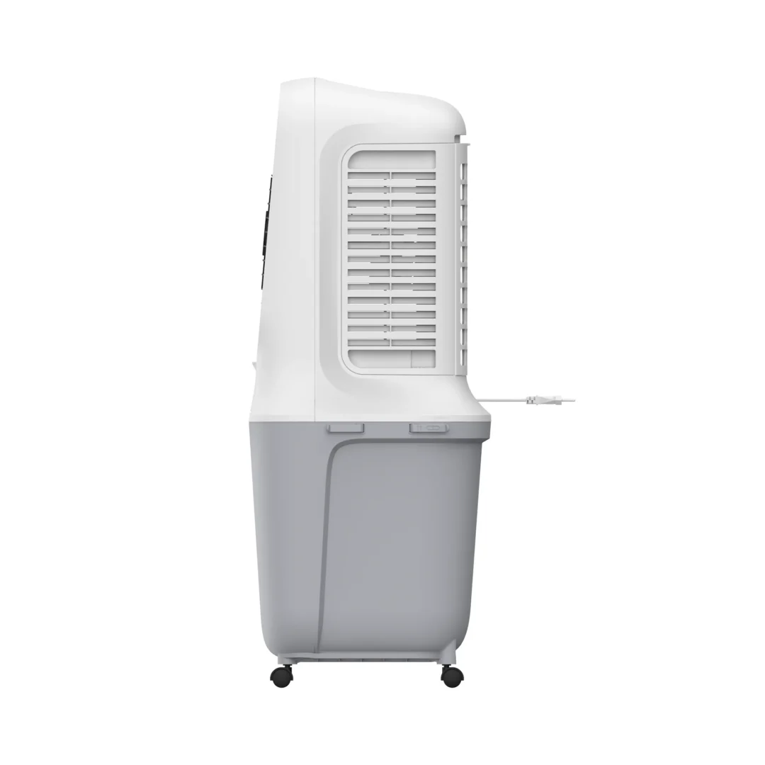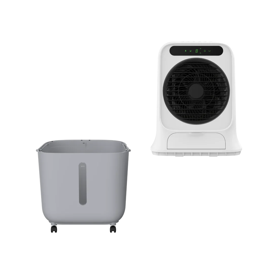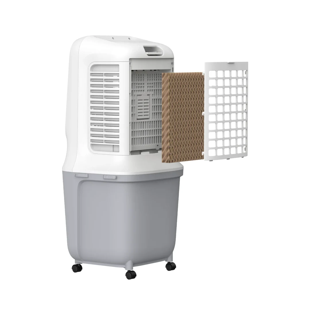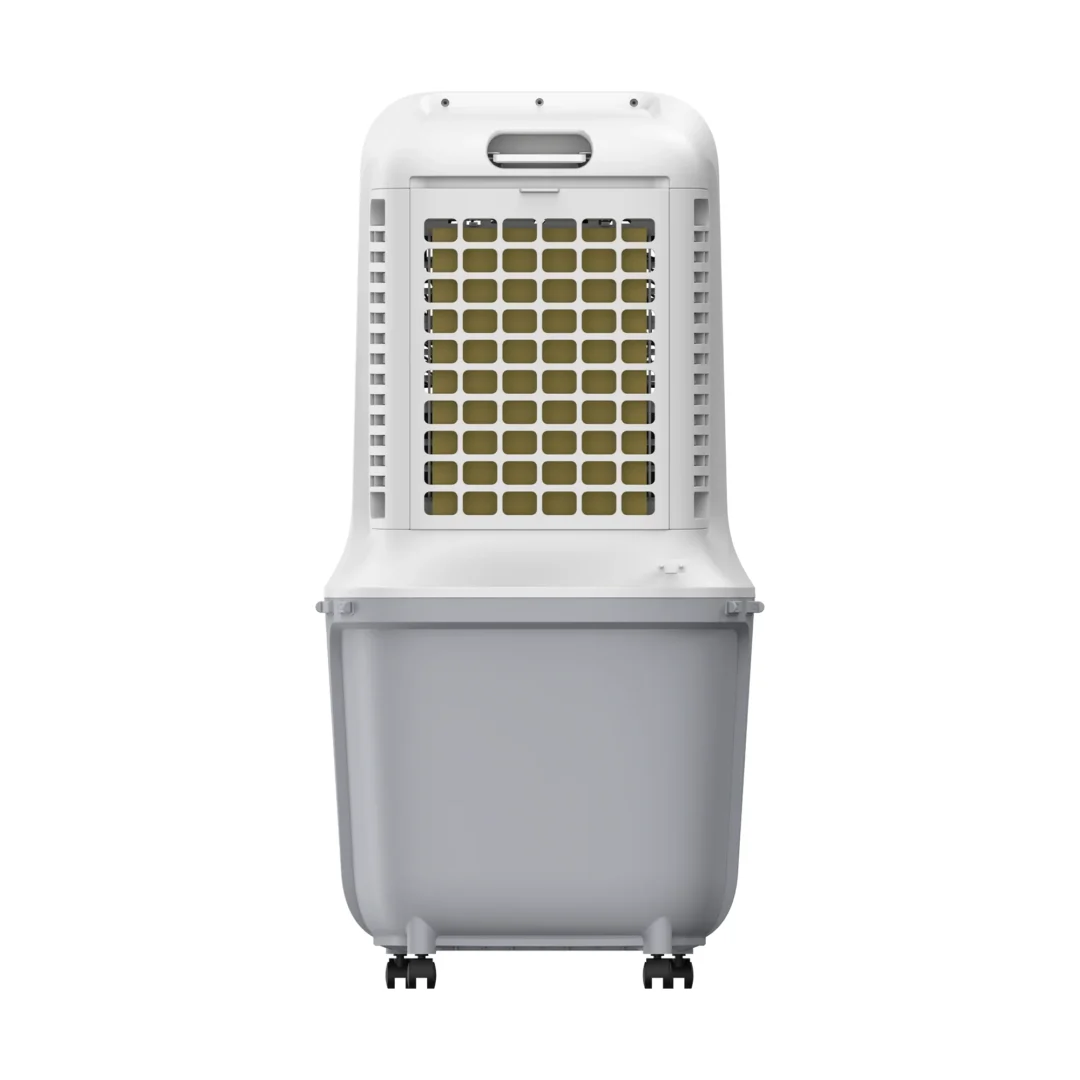 Designed for long-range airflow, this cooler is built to perform in style. Key Features: Vortex Fan System: With vortex blades, wind-directing grill, and a blowing distance up to 13 meters, strong enough to rebound off walls. Natural Evaporative Cooling: Warm, dusty air passes through a moistened cooling pad, delivering cool, fresh air while dropping temps by 6–8℃. DIY Ice Cooling: Add your own ice cubes to enhance the cooling effect even further. Air Filtration System: Dustproof filter and cooling pad collect particles and trap them in the water tank. Smart Control & Easy Operation Remote & button controls with an LED display 3 wind modes: Normal, Natural, and Sleeping 3 fan speeds up to 1500m³/h 1–9 hour timer & power-off memory function Thoughtful Design 25L detachable water tank with top-invert loading Two refill options: remove the tank or pour in manually Auto-drying function dries the cooling pad before storage—reduces mildew and bacteria Water shortage protection (indicator light flashes) 360° rotating wind guider for all-around airflow Specifications:• Cooling Power: 90W• Wind Distance: 13 meters• Airflow: High/Mid/Low• Inlets: 3-side air intake, 1-side cooling pad• Removable cooling pad & dust filter