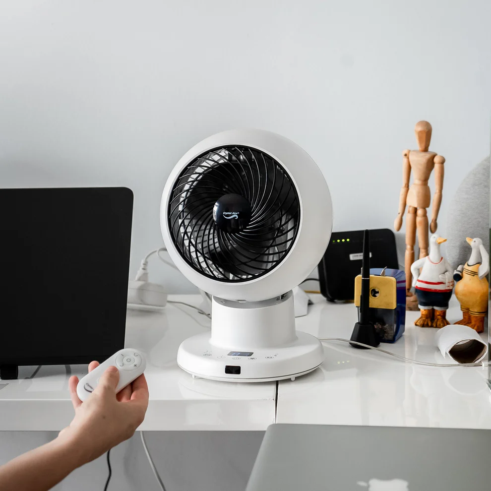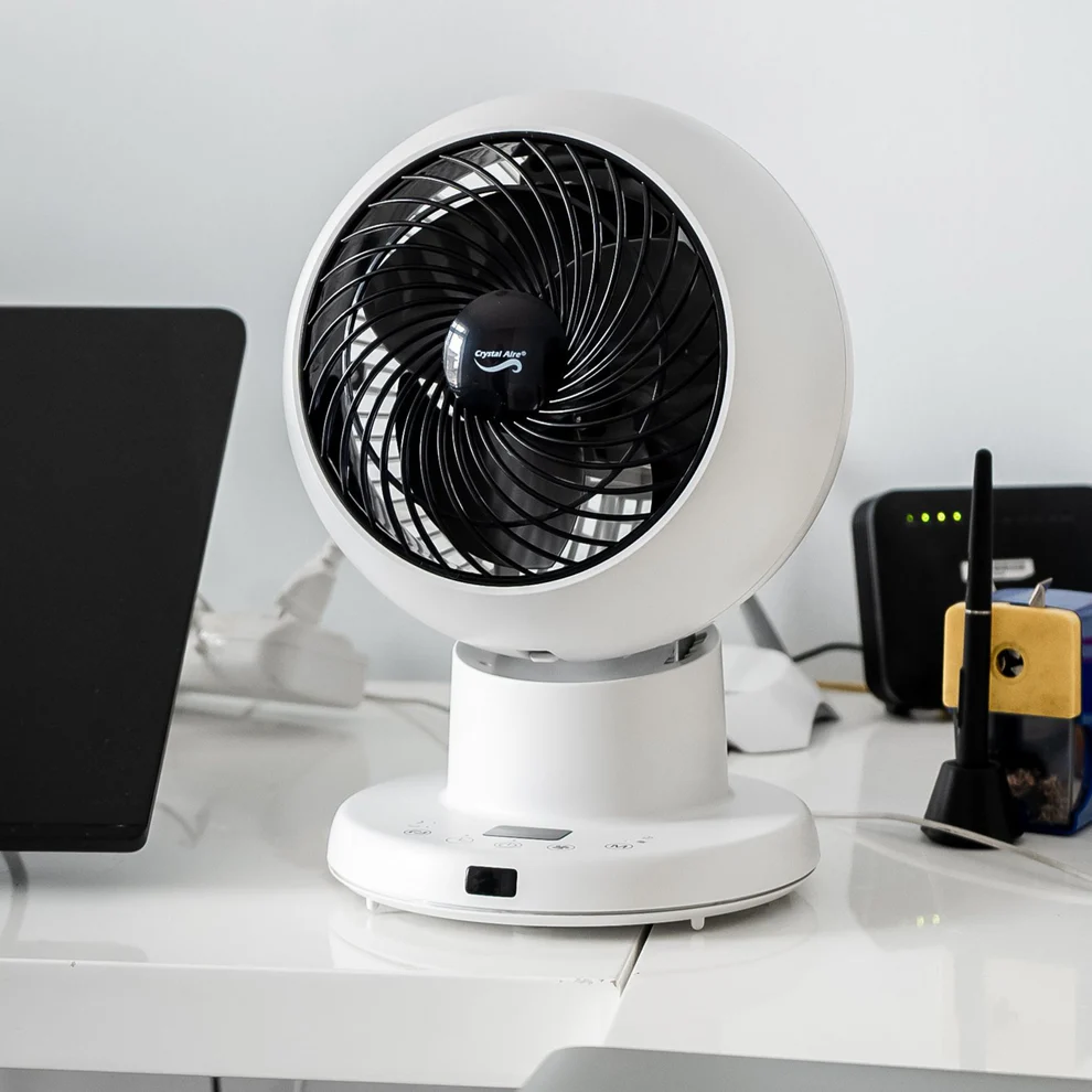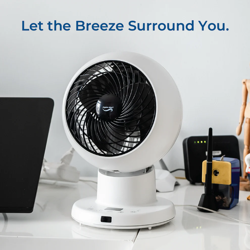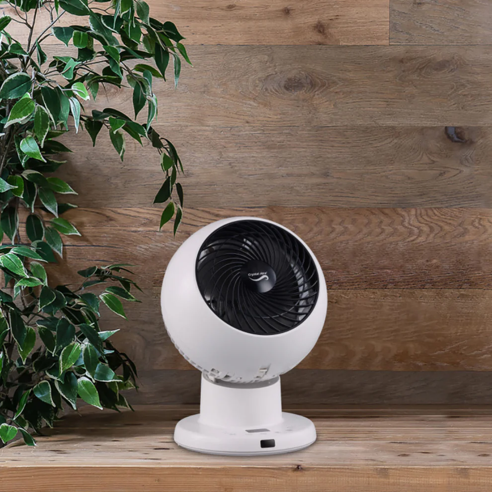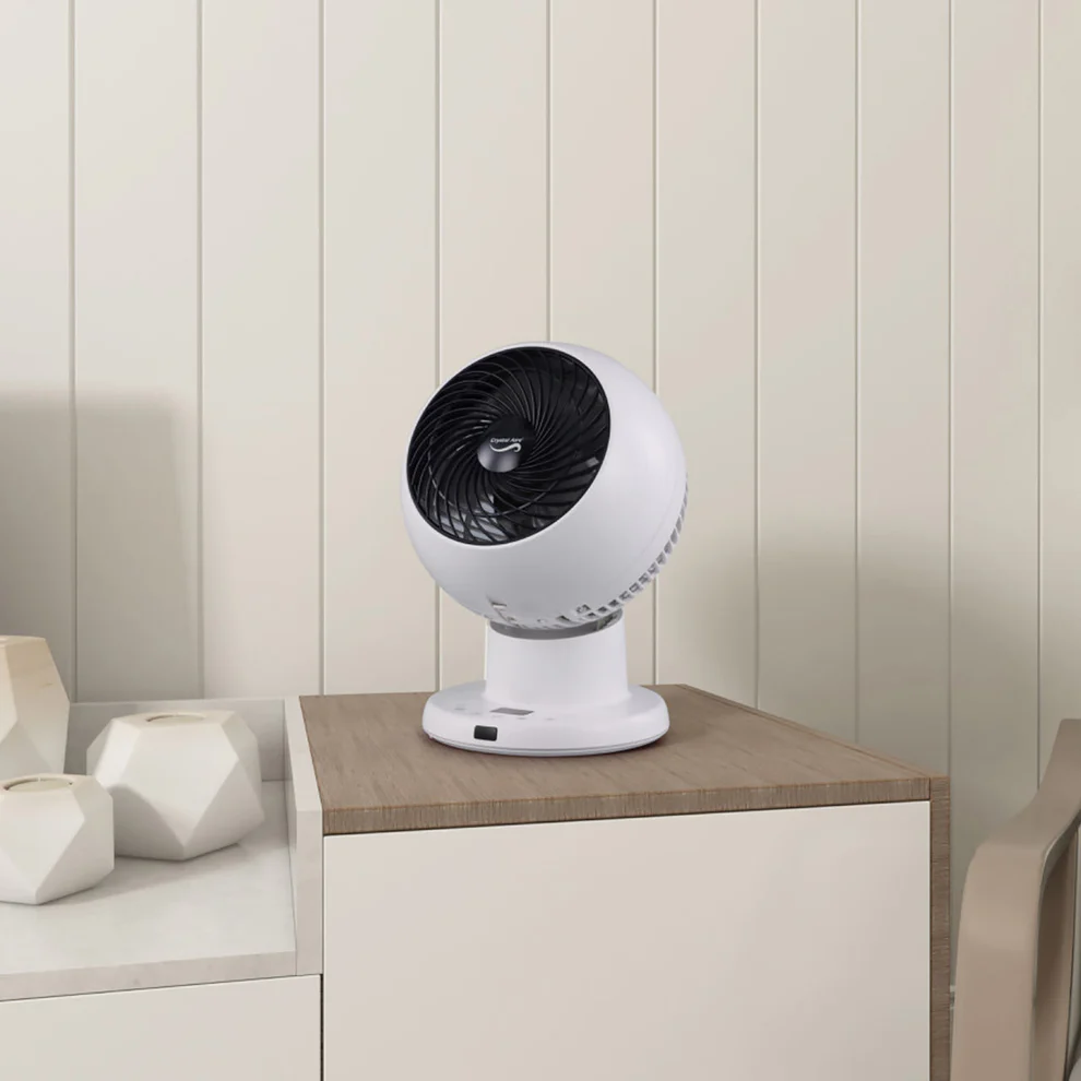 The Crystal Aire Turbo Cool Fan has 8 fan speeds, it rotates left and right 75 degrees on its base, and the head moves 75 degrees up and down. From the stylish Control Panel on the base, there is an LCD screen. From here you can control the movements of the fan up or down, left or right. You can also set the timer for 1 to 8 Hours or run the fan continuously. You may adjust the fan speed, there are 8 different speeds. When you select sleep mode the fan reduces its noise to a quiet mode while still blowing air consistently and at a comfortable speed. It comes with a remote for easy control.